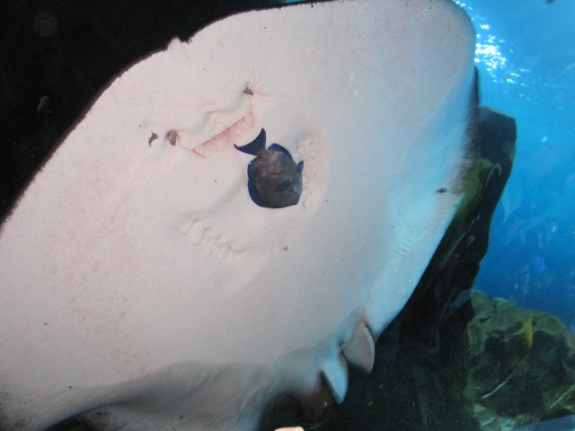 아래의 사진을 자세히 보면 대형 가오리의 몸체에 작은 물고기가 갇쳐있다.