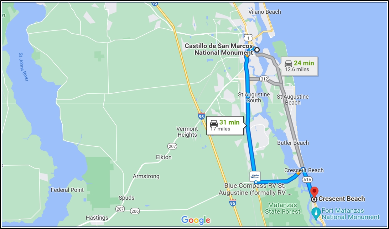 크레센트 비치 — 끝없이 펼쳐진 대서양의 고요함 카스틸로 데 산 마르코스 국립기념공원을 떠나 남쪽으로 약 30분 정도 달리면 세인트 어거스틴의 해변 중에서도 한층 더 조용하고 여유로운 **크레센트 비치(Crescent Beach)**에 닿는다. 이곳의 첫인상은 ‘끝이 보이지 않는다’는 말이 어울릴 만큼 광활한 해변이다. 넓게 펼쳐진 모래사장 위에는 소수의 관광객만이 자리해 햇살을 즐기며 한가로운 시간을 보내고 있었다.