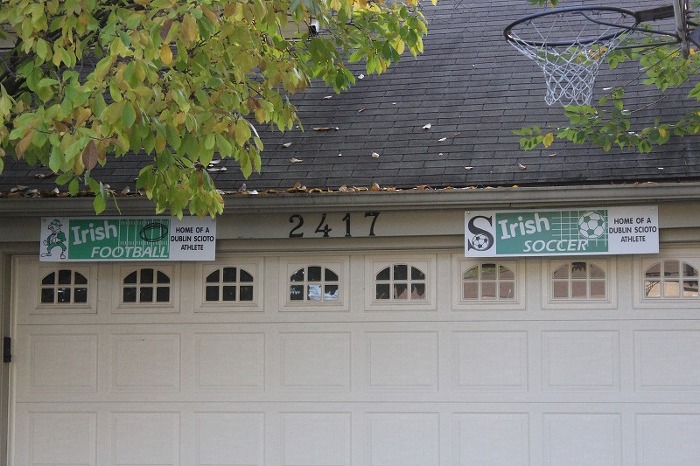 더불린 사이오토 고등학교에서 축구와 미식축구를 한다는 사인. 자녀가 학교에서 팀에 들어있으면 거주하는 집의 차고입구 외벽에 표시하는 간판이다.