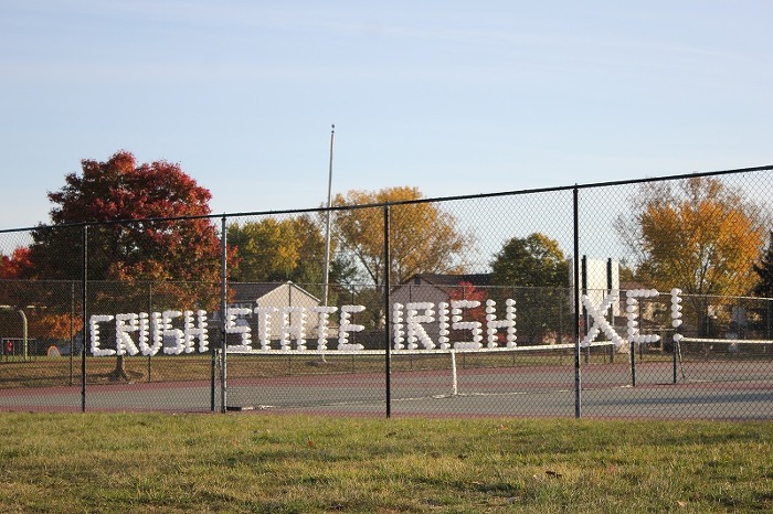 주말에 있을 미식축구때 이웃의 아이리쉬 팀을 뭉게벼려라는 문구을 종이 컵으로 철조망을 이용하여 글을 새겨 넣었다.