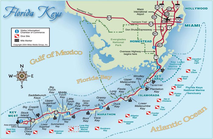 그런 곳이 세상에서 딱 한군데 있다. 일렬로 늘어선 수많은 섬들, 그 섬들을 잇는 수많은 다리, 미국 본토 최남단의 열도인 플로리다 키즈(Florida Keys), 우리는 바로 이곳을 향해 달리고 있으며 열도의 끝에 자리잡은 남국의 열정과 낭만을 간직한 채 모습을 드러내는 조그만 섬, 키 웨스트(Key West) 를 보기 위해서 이다. 미국 본토와 키웨스트 사이를 42개의 다리를 건너면서 체험하는 산호초와 바다는 황홀할 정도이다. 키웨스트 방향으로, 오른쪽은 멕시코 만과 애버글래이즈 배이, 왼편으로는 대서양을 바라보며 달린다. 본토에서 다리를 건너 Key Largo 섬의 관광 안내소에서 지도와 필요한 안내를 받았다.