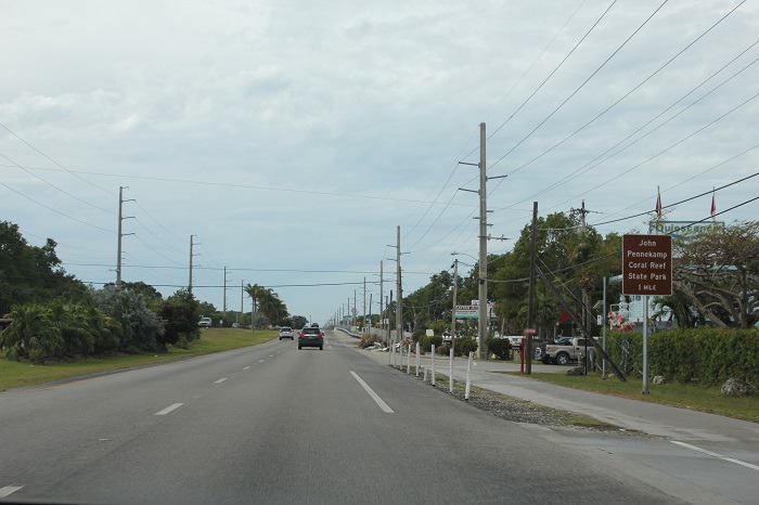 도로를 따라 오른쪽에 스노클링, 유리 바닥 보트 투어 및 카약을 통해 생동감있는 해양 생물을 볼 수있는 해저 공원의 사인이 보인다. (John Pennekamp Coral Reef State Park)