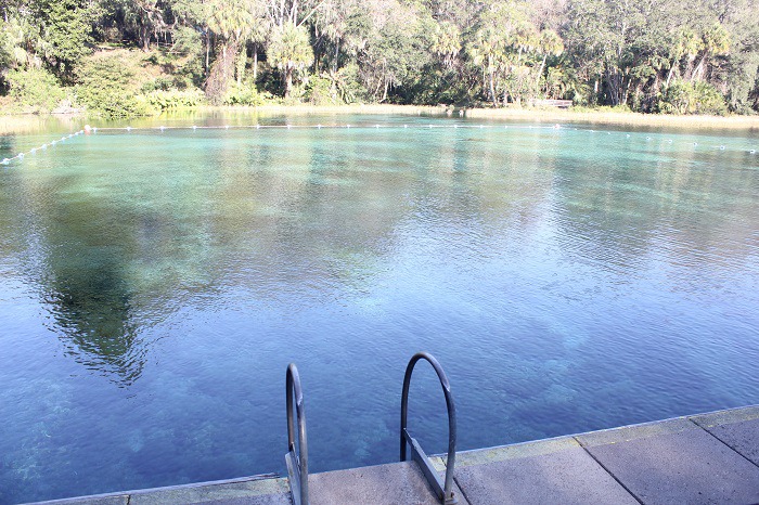 사진을 자세히 관찰하면 미국 백인 여성이 수영을 하고 있는 모습이 보인다. 담수된 스프링즈 수영장의 물이 바깥온도보다 따뜻하다 물밖으로 나오기 싫다고 외친다. 스프링즈 물의 연중 온도는 화씨 72도(섭씨 21도) 로 인간에게 가장 편안한 (Comfortable) 최적의 온도이다.