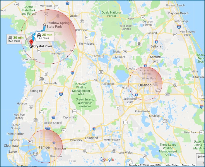 레인보우 스프링즈 주립공원은 디즈니 월드가 있는 올란도와 살기좋은 도시 템파에서 각각 1시간 30분, 비교적 가까운 거리에 위치하고 있어 플로리다 여행계획에 포함하는 하는 것이 좋다. 우리는 일행이 있어 뜻을 이루지 못했지만, 여름에 방문한다면 꼭, 커누 혹은 카약을 타고 강을 오르 내리며 탐험하는 것은 상상하지 못할 백미이다.