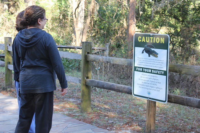 레인보우 스프링즈 강에는 악어가 서식하고 있으니 주의하라는 경고문