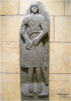 스코틀랜드 국립박물관에 소장된 16세기 석조 부조의 주인공이 가슴에 품고 있는 클레이모어. <출처: (cc) Kim Traynor at Wikipedia.org> |