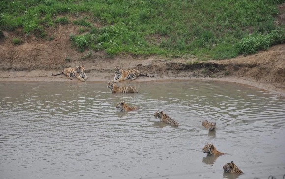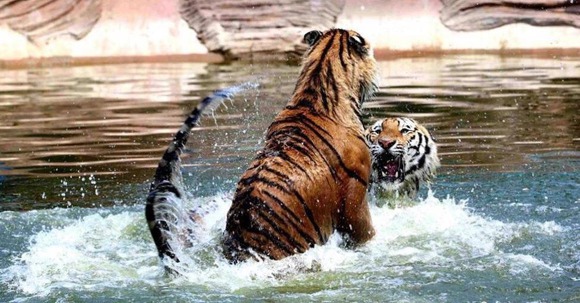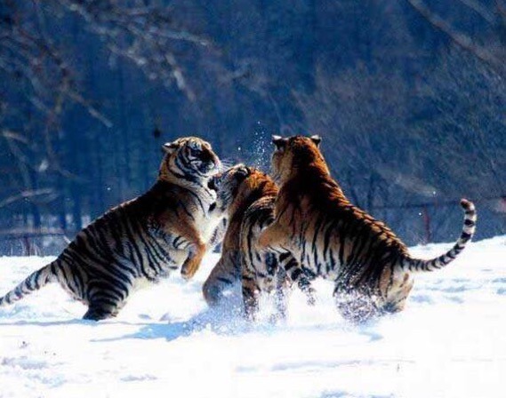 (那些东北虎在水中嬉戏。)