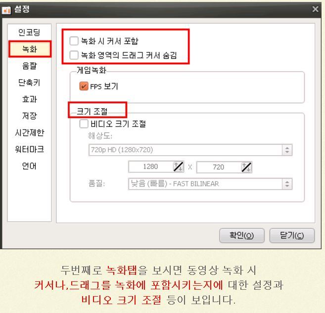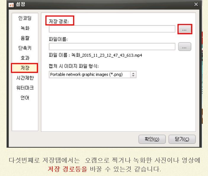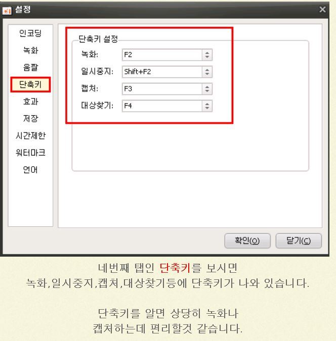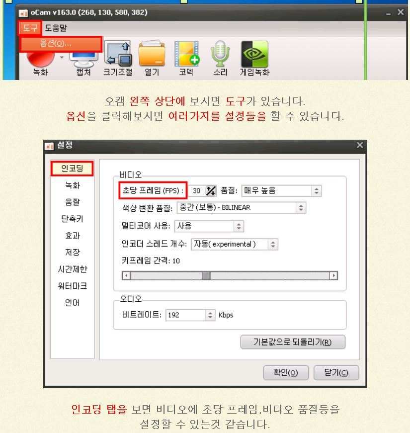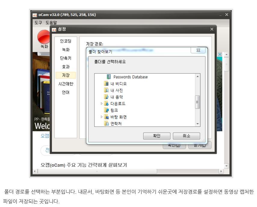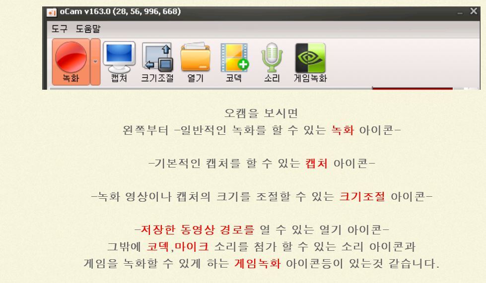 ********************************************************************************************* 오캠 v157.0 누구나 무료 화면녹화 프로그램 다운로드본 프로그램은 사용에 아무런 제한이 없는 프리웨어입니다. 개인, 기업, 관공서, 교육기관, PC방 누구나 무료로 사용이 가능합니다. 오캠(oCam)은 간단한 조작만으로 컴퓨터 화면 및 소리를 쉽게 동영상으로 녹화할 수 있습니다. 추가로 화면 캡쳐 기능을 제공합니다. 이번 버전에 추가되거나 변경된 내역은 다음과 같습니다. 참고로 게임녹화를 할 경우 게임녹화 버튼을 클릭하여 아래와 같이 모드를 변경하면 되고, 원래대로 되돌릴려면 다시 게임녹화 버튼을 클릭하면 됩니다 코덱선택으로 GIF(움짤) 녹화가 가능합니다. ■ 기능추가 및 수정 - GIF(움짤) 녹화 지원 (GIF 게임 녹화는 다음버전에 지원예정) - 특정한 상황에서 64비트 게임에 FPS 표시가 뜨지 않고 녹화가 안되는 점 수정 - 헝가리안 언어 업데이트 ■ 간략한 소개 및 사용법 우선 툴바 아이콘은 총 7가지가 있는데, 순서대로 녹화, 캡쳐, 크기조절, 열기, 설정, 코덱, 정보가 제공되고 있습니다. 녹화(F2)와 캡처(F3) 그리고 대상찾기(F4) 입니다. 추가로 일시중지/다시시작 기능은 (Shift + F2) 입니다. F2눌러 녹화하고, F2눌러 녹화중지하면 되며, 열기로 저장된 폴더 열면 저장된 파일을 볼 수 있습니다. 참고로 단축키는 사용자가 자유롭게 변경가능합니다. 오캠은 내장코덱를 지원하며, 그 외에도 전문가 수준의 다양한 코덱을 지원하고 있습니다. 그리고 기본제공되는 내장코덱이 없다면, 외장코덱을 이용해 xvid 와 같은 강력한 코덱사용도 가능합니다. 설정메뉴에 들어가면 프레임/비트레이트 조절을 통한 화질설정 및 녹화 시간제한 등을 설정해서 쓸 수 있습니다. 녹화 시간제한은 녹화를 하면, 몇분후에 자동으로 녹화를 끝낼지, 녹화 후에 시스템을 종료할지 등을 설정할 수 있는 강력한 기능입니다. 또한 멀티코어를 지원하며, 저사양PC의 경우 멀티코어 옵션을 조절할 수도 있습니다. 그 외에 본인이 원하는 워터마크 삽입도 가능합니다. 이 외에도 다양한 기능들이 있으며, 도움말 게시판을 참고 하세요. http://ohsoft.net/ko/bbs/board.php?bo_table=ocam_help %%%%%%%%%%%%%%%%%%%%%%%%%%%%%%%%%%%%%%%%%%%%%%%%%%%%%%%%%%%%%% *********************************************************************************************************** 녹화 시 마이크와 컴퓨터 소리를 같이 녹음하는 방법 (.. 녹화 시 마이크와 컴퓨터 소리를 같이 녹음하는 방법 ( 윈도우 비스타, 7, 8 ) 오캠 메인 창에서 소리 버튼을 클릭합니다. 다음과 같은 메뉴가 뜨며 기본적으로 마이크 녹음 안함에 체크되어 있습니다. 녹음하려는 마이크를 선택합니다. ( 마이크가 목록에 나오지 않을 경우 아래 내용을 참고하세요. ) 체크하게 되면 다음과 같이 설정이 적용되며 마이크가 같이 녹음됩니다. 다음은 마이크를 연결했음에도 불구하고 마이크 장치가 위에 목록에 나오지 않을 경우 다음과 같은 진행합니다. ( 아래처럼 마이크와 관련 된 메뉴가 아예 뜨지 않고 시스템 소리 녹음 메뉴만 뜨거나, 마이크 항목이 나오긴 하는데 모든 마이크 장치가 나오지 않는 경우, 간혹 오디오 인터페이스를 따로 구매하여 사용하시는 경우에는 기본 마이크 장치가 아닌 오디오 인터페이스 장치가 목록에 나와야 하며 나오지 않는다면 이 절차를 따라하세요. ) 시작 메뉴 - 제어판으로 이동합니다. 제어판에서 소리 항목을 찾아서 클릭합니다. 다음과 같은 창이 뜨게 되며, 녹음 탭을 클릭합니다. 녹음 탭으로 이동하게 되면 오디오 장치가 설정되어 있지 않습니다. 라고 되어 있는 하얀색 배경에서 오른쪽 버튼을 클릭하여 팝업 메뉴를 엽니다. ( 또는 목록에 녹음 장치가 나오긴 하는데 원하는 장치가 나오지 않음 ) 사용할 수 없는 장치 표시를 클릭합니다. 사용하려는 마이크 장치를 선택하고 오른쪽 버튼을 눌러 사용을 클릭합니다. ( 오디오 인터페이스를 사용하는 경우 마이크 외에 별도로 라인 입력이라는 녹음 장치가 나올 수 있으며 해당 장치로 녹음하셔야 합니다. ) 오캠에 소리 버튼을 클릭하여 마이크 장치가 정상적으로 나오는지 확인합니다. |