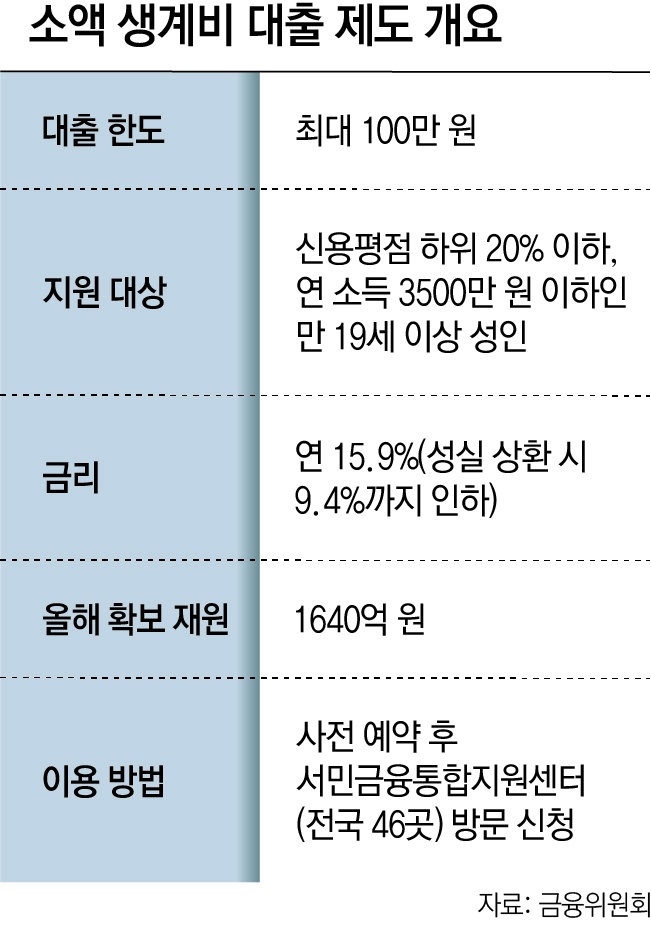소액 생계비 대출은 수십만 원을 구하지 못해서 불법 사금융으로 내몰리는 금융 취약계층을 지원하기 위해 마련된 제도다. 금융당국은 대출 상담 과정에서 채무 조정이나 복지, 일자리 상담을 함께 받도록 하는 일종의 ‘미끼상품’ 역할도 하고 있다고 설명한다.》