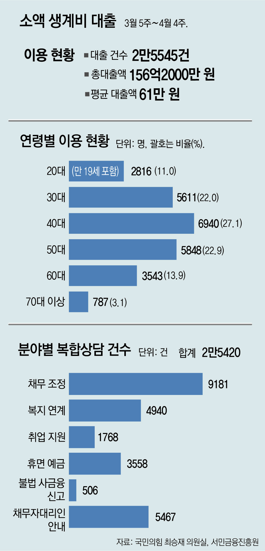 희귀병을 앓는 자녀의 입원 비용을 납부하거나 외손자를 양육하면서 연체된 공과금을 내기 위해 상담 창구를 찾은 경우도 있었다. 희귀병 치료비 지원이나 기초생활수급자 대상 지원을 받고 있음에도 현금이 필요한 비용을 제대로 납부하지 못해서 소액 생계비 대출을 받은 사례들이다. 최승재 의원은 “경제적 취약계층이 최근 악화된 경기 상황과 코로나19 여파 등으로 한계 상황까지 내몰리면서 소액 생계비 대출을 신청하는 사례가 다수로 보인다”며 “소액 생계비 대출 확대를 포함해 이들의 어려움 해소와 재기를 도울 수 있는 다양한 대책이 시급하다”고 말했다.