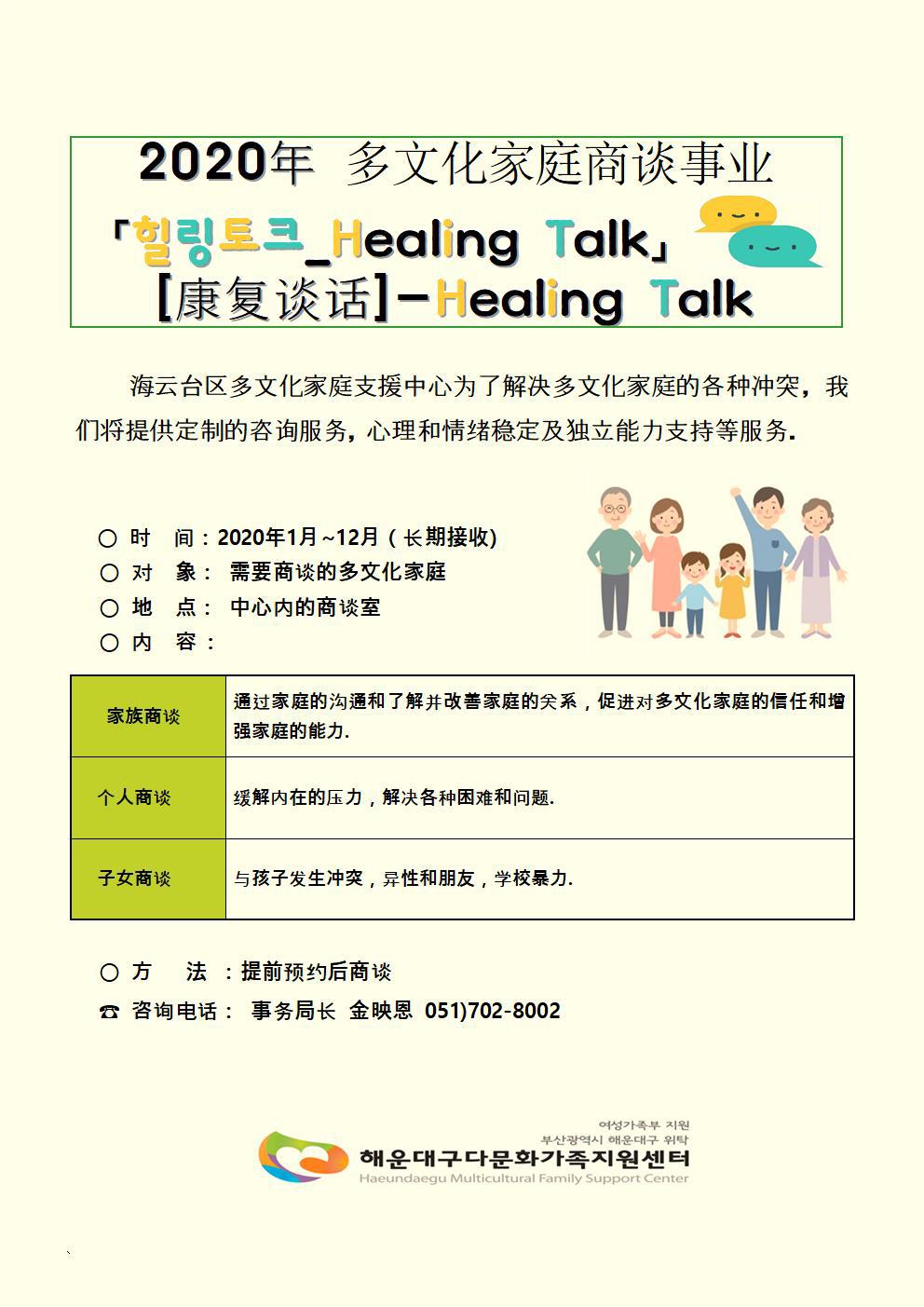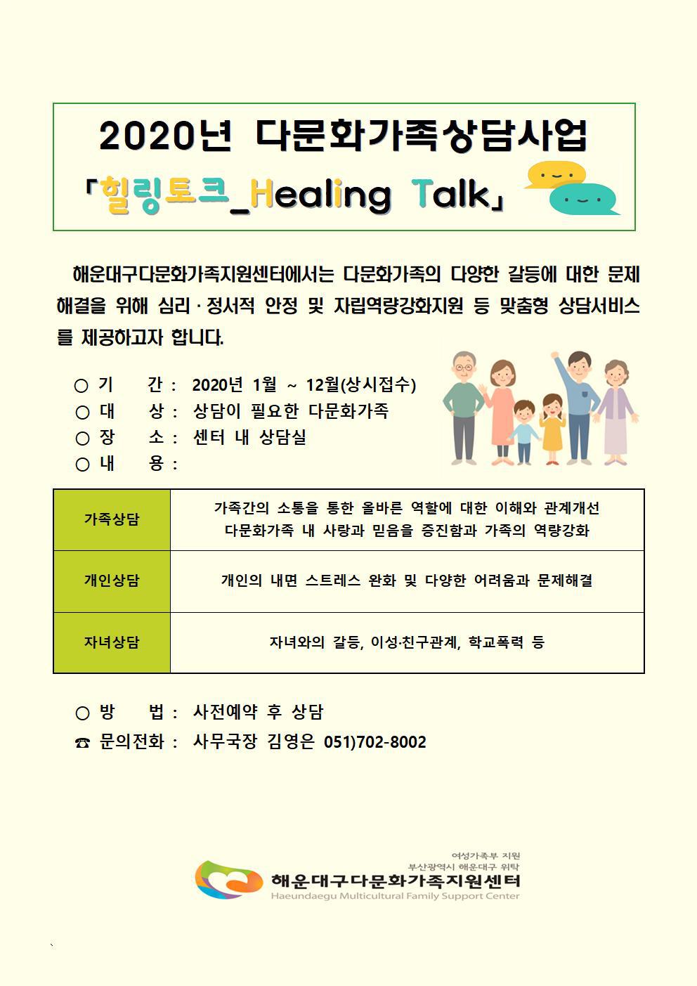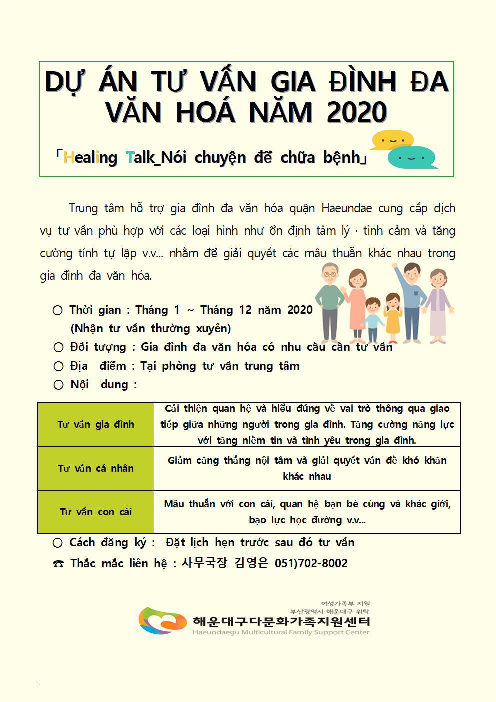 [안내]2020년상담사업안내(한국어, 베트남어, 중국어) 작성자해운대구다문화가족지원센터|작성시간20.02.27|조회수257 목록 댓글 0 글자크기 작게가 글자크기 크게가 다음검색 현재 게시글 추가 기능 열기 북마크 공유하기 신고 센터로 신고 댓글 댓글 0 댓글쓰기 답글쓰기 댓글 리스트