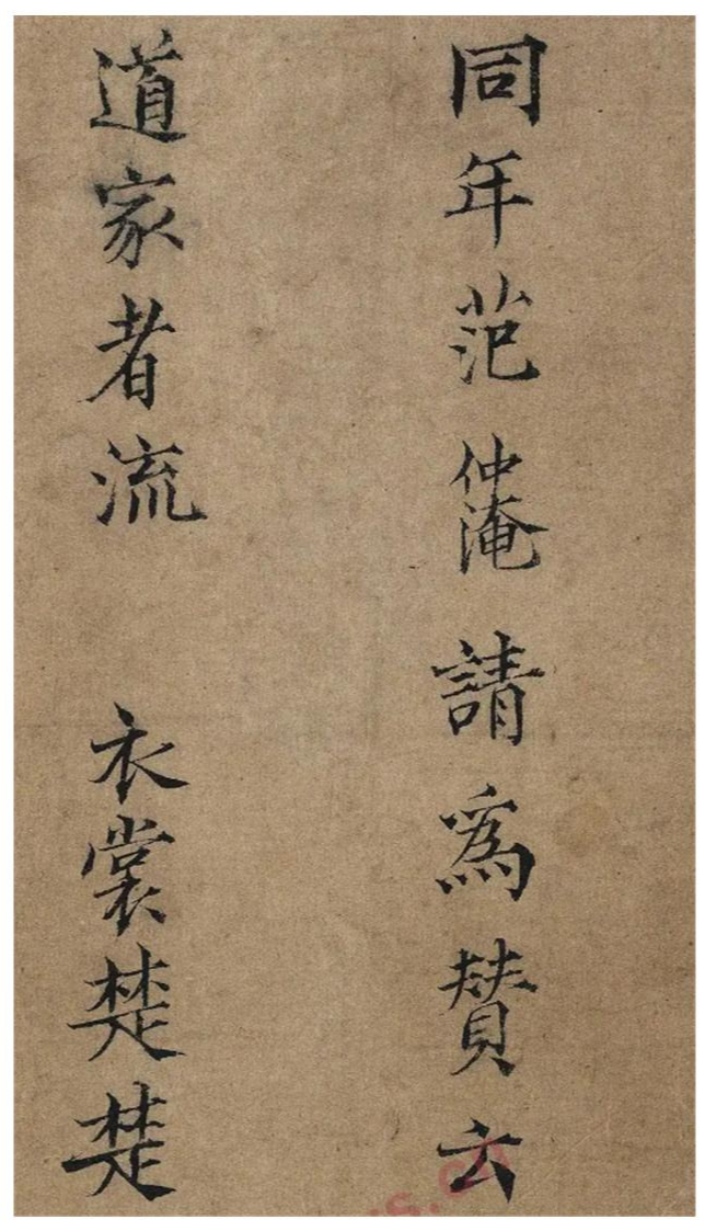 북송시기 범중암(范仲淹, 989-1052)은 북송 수도 개봉(開封)에서 비서성(秘書省) 교서랑(校書郎)을 지내던 32살(1021)에 1015년 진사시험 동년 합격자(進士 同年)이며 평해군(平海軍, 현재 산동성 登州에 주둔한 水師)에서 서기(書記)를 맡은 허염(許琰)이 도가(도교)의 옷을 지어 입은 것을 보고 찬양하는 글 「도복찬(道服贊)」을 종이에 썼다고 합니다. 단정한 해서체이며 크기는 세로 34.8cm 가로 47.9cm입니다. 이 작품은 범중암의 작품 가운데 유일하게 현존하는 것이라고 합니다. 물론 범중암이 도사의 복식을 찬양한 배경에는 본인이 도교를 숭상하였기 때문이며 「태청궁을 지나며(過太淸宮)」 칠언절구에서 보여줍니다.