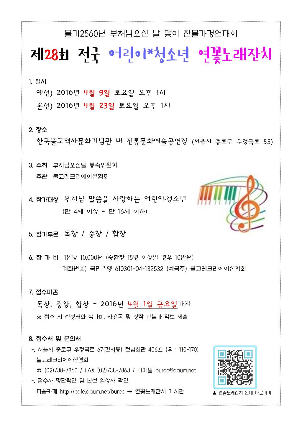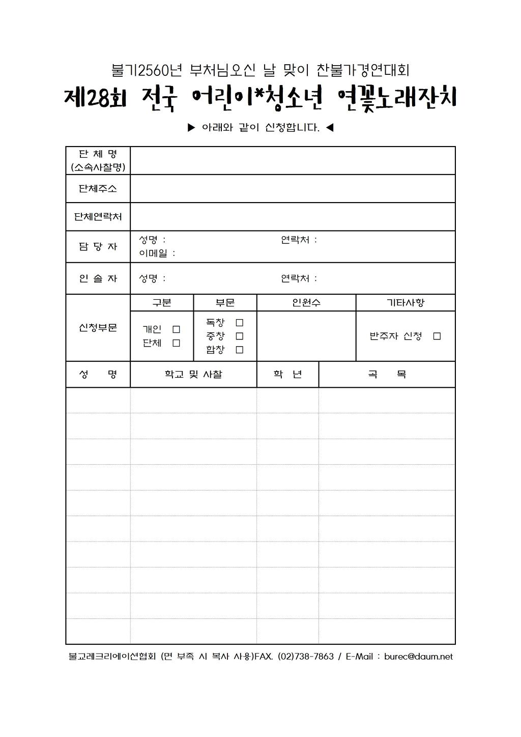 [스크랩] 제28회 전국 어린이*청소년 연꽃노래잔치 안내 작성자burec|작성시간16.03.11|조회수12 목록 댓글 1 글자크기 작게가 글자크기 크게가 신청서는 아래 첨부파일을 다운받아 사용하시기 바랍니다^^ 제28회 연꽃노래잔치 신청서.hwp 첨부파일첨부된 파일이 5개 있습니다. hwp 파일 제28회 연꽃노래잔치 신청서.hwp 다운로드 jpg 파일 제28회 연꽃노래잔치 안내문1002.jpg 다운로드 jpg 파일 제28회 연꽃노래잔치 신청서001.jpg 다운로드 jpg 파일 제28회 연꽃노래잔치 안내문1001.jpg 다운로드 jpg 파일 0212 연꽃노래잔치 포스터A3_01.jpg 다운로드 다음검색 스크랩 원문 : 불교레크리에이션협회 현재 게시글 추가 기능 열기 북마크 공유하기 신고 센터로 신고 댓글 댓글 1 댓글쓰기 답글쓰기 댓글 리스트 작성자나무보현보살 | 작성시간 16.03.27 감사합니다. 댓글 전체보기