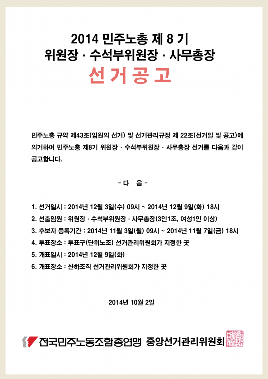 선거공고 - 민주노동조합총연맹 선거공고 및 부산지역본부 선거공고 작성자부산학비|작성시간14.10.02|조회수53 목록 댓글 0 글자크기 작게가 글자크기 크게가 KakaoTalk_20140930_120215956.png KakaoTalk_20140930_120216316.jpg 첨부파일첨부된 파일이 4개 있습니다. png 파일 2014kctu.png 다운로드 jpg 파일 KakaoTalk_20140930_120216316.jpg 다운로드 png 파일 KakaoTalk_20140930_120215956.png 다운로드 jpg 파일 KakaoTalk_20140930_120216316.jpg 다운로드 다음검색 현재 게시글 추가 기능 열기 북마크 공유하기 신고 센터로 신고 댓글 댓글 0 댓글쓰기 답글쓰기 댓글 리스트