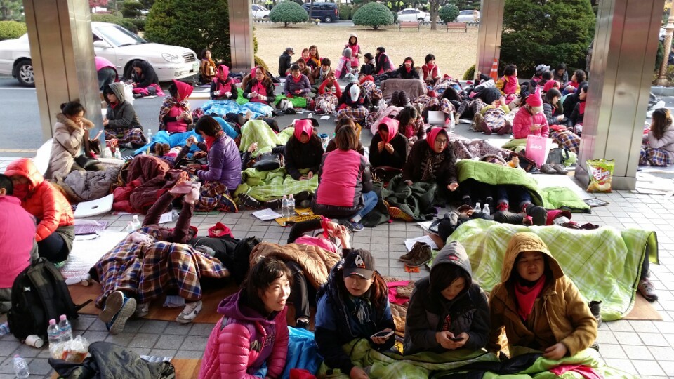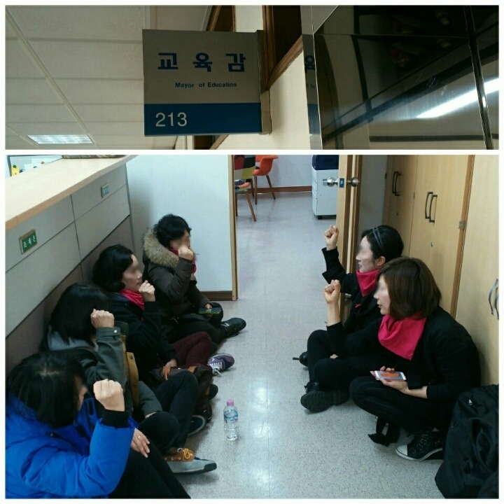 교육감실에 들어간 7명의 조합원과 본관앞 노숙 농성투쟁을 새벽4시까지 이어가던 중.