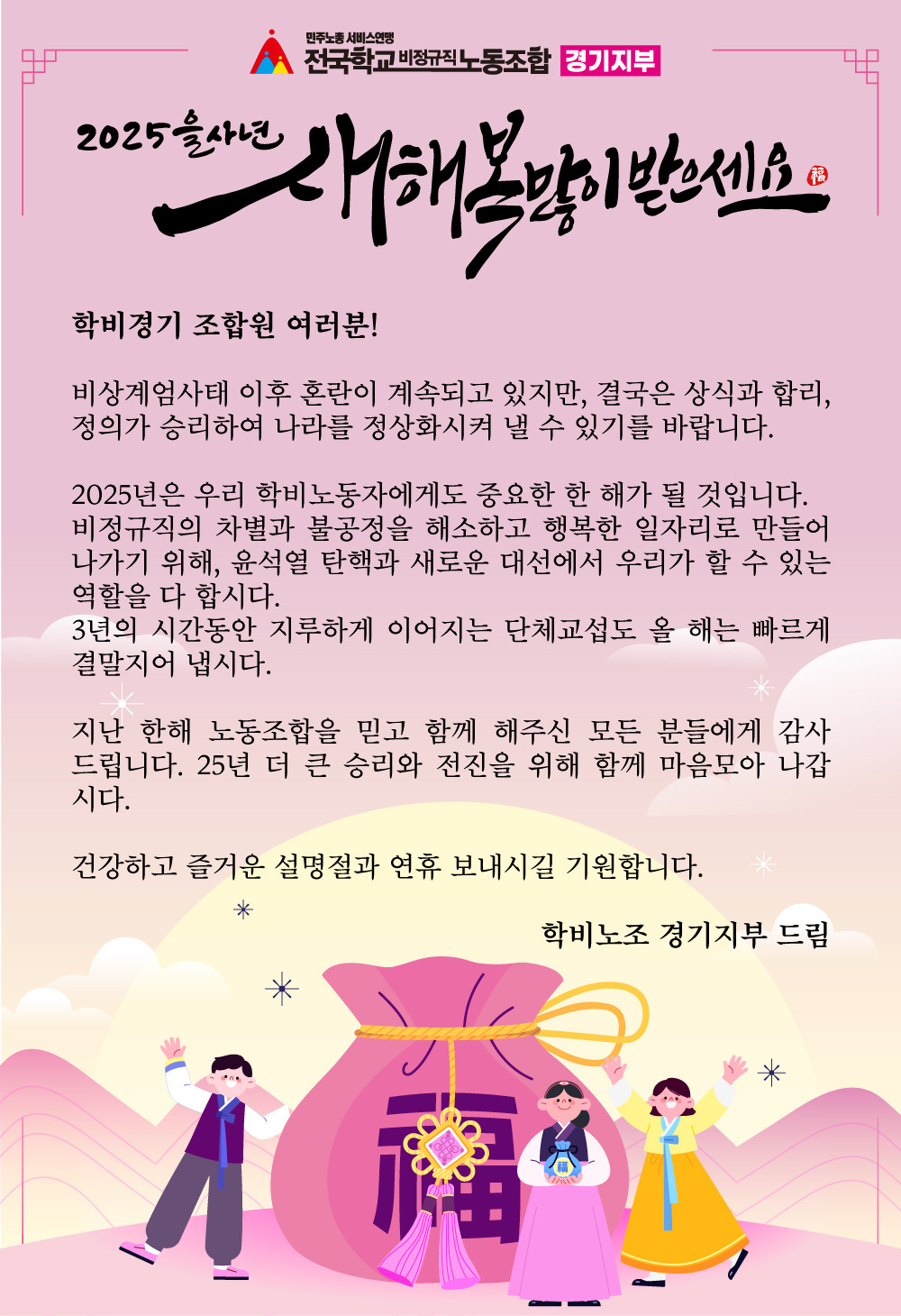 2025 설 인사 ' 더 큰 승리와 전진을 위해 함께 나갑시다!' 작성자경기학비|작성시간25.01.24|조회수683 목록 댓글 0 글자크기 작게가 글자크기 크게가 다음검색 현재 게시글 추가 기능 열기 북마크 공유하기 신고 센터로 신고 댓글 댓글 0 댓글쓰기 답글쓰기 댓글 리스트