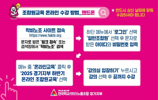 2025 하반기 조합원교육 온라인 수강방법 작성자경기학비|작성시간25.10.13|조회수292 목록 댓글 0 글자크기 작게가 글자크기 크게가 다음검색 현재 게시글 추가 기능 열기 북마크 공유하기 신고 센터로 신고 댓글 댓글 0 댓글쓰기 답글쓰기 댓글 리스트
