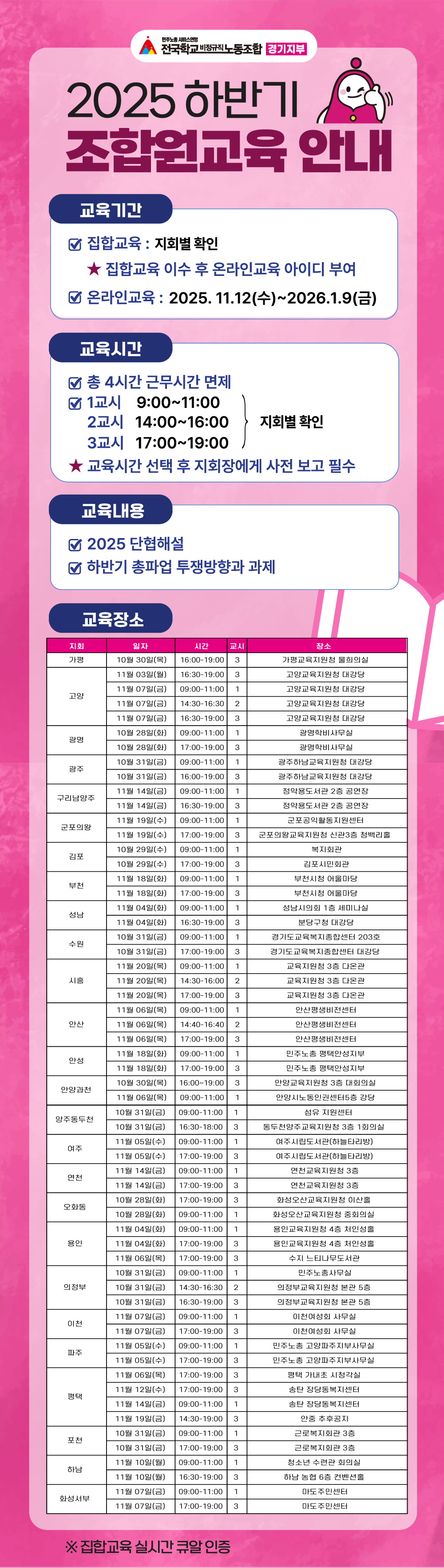 2025 하반기 학기중 조합원교육 안내 작성자경기학비|작성시간25.10.13|조회수2,954 목록 댓글 0 글자크기 작게가 글자크기 크게가 다음검색 현재 게시글 추가 기능 열기 북마크 공유하기 신고 센터로 신고 댓글 댓글 0 댓글쓰기 답글쓰기 댓글 리스트