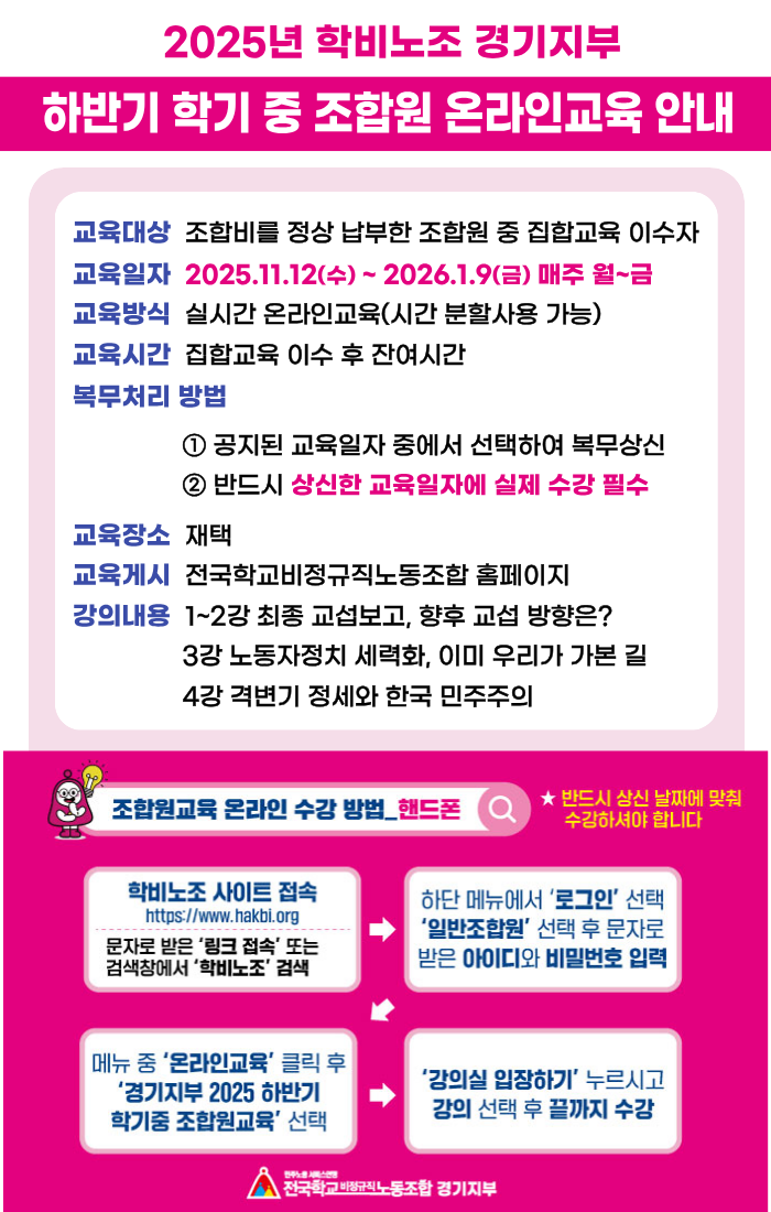 2025 하반기 학기 중 조합원 온라인 교육 안내 작성자경기학비|작성시간25.11.10|조회수3,202 목록 댓글 0 글자크기 작게가 글자크기 크게가 다음검색 현재 게시글 추가 기능 열기 북마크 공유하기 신고 센터로 신고 댓글 댓글 0 댓글쓰기 답글쓰기 댓글 리스트