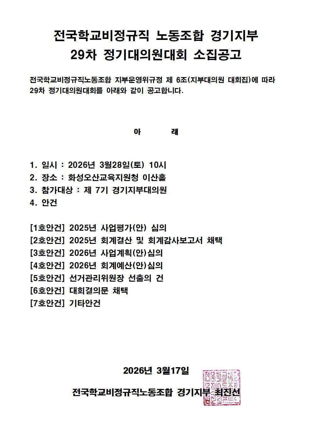 제 29차 정기대의원대회 소집공고 작성자경기학비|작성시간26.03.17|조회수45 목록 댓글 0 글자크기 작게가 글자크기 크게가 다음검색 현재 게시글 추가 기능 열기 북마크 공유하기 신고 센터로 신고 댓글 댓글 0 댓글쓰기 답글쓰기 댓글 리스트