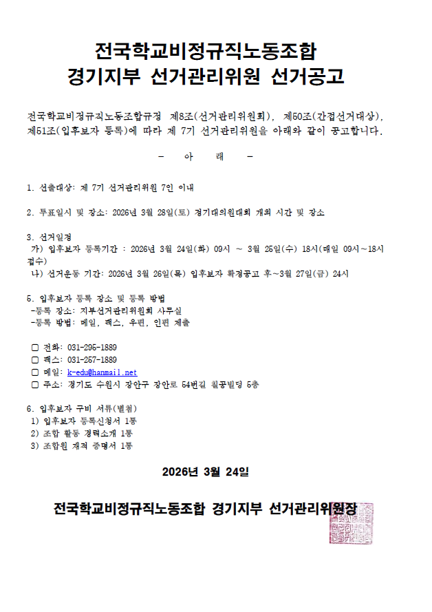 제7기 경기지부 선거관리위원 후보 등록 공고 작성자경기학비|작성시간26.03.24|조회수18 목록 댓글 0 글자크기 작게가 글자크기 크게가 다음검색 현재 게시글 추가 기능 열기 북마크 공유하기 신고 센터로 신고 댓글 댓글 0 댓글쓰기 답글쓰기 댓글 리스트