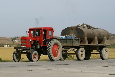 북한 전역에서 사용되는 빨갛게 칠해진 이 트랙터들은 강서군에 있는 금성뜨락또르공장 에서 생산됩니다.