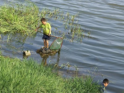 아이들이 대동강에서 낚시를 하고 있습니다.