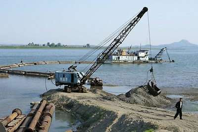 평양 부근의 대동강에서 모래를 퍼내고 있습니다.
