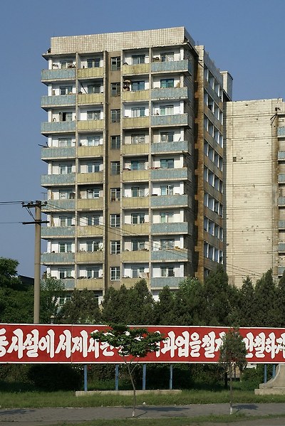 평양시 평천 강안거리의 타일로 된 아파트입니다.