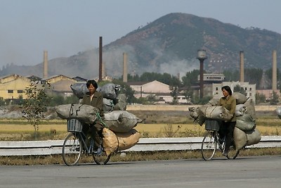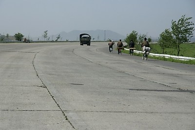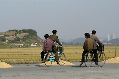 평양-남포 고속도로에서 본 자전거를 탄 사람들입니다.