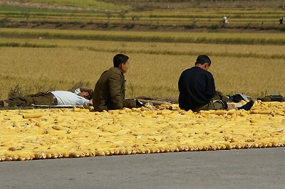 농사철에 들판은 사람들로 가득찹니다. 그들 대다수는 인근의 공장 또는 근무처에서 동원되어집니다.