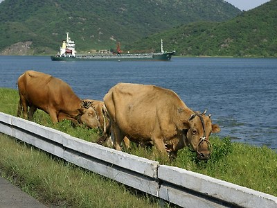 소들이 고속도로 바로 옆에서 풀을 뜯고 있습니다. 뒷배경은 대동강입니다.