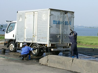 수도로 들어 가기 전에 트럭을 세차하고 있습니다. 바로 옆이 평양-남포 고속도로입니다.
