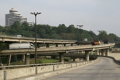 평양-남포 고속도로의 출발점인 안골립체다리입니다. 완쪽에 량강호텔이 있습니다.