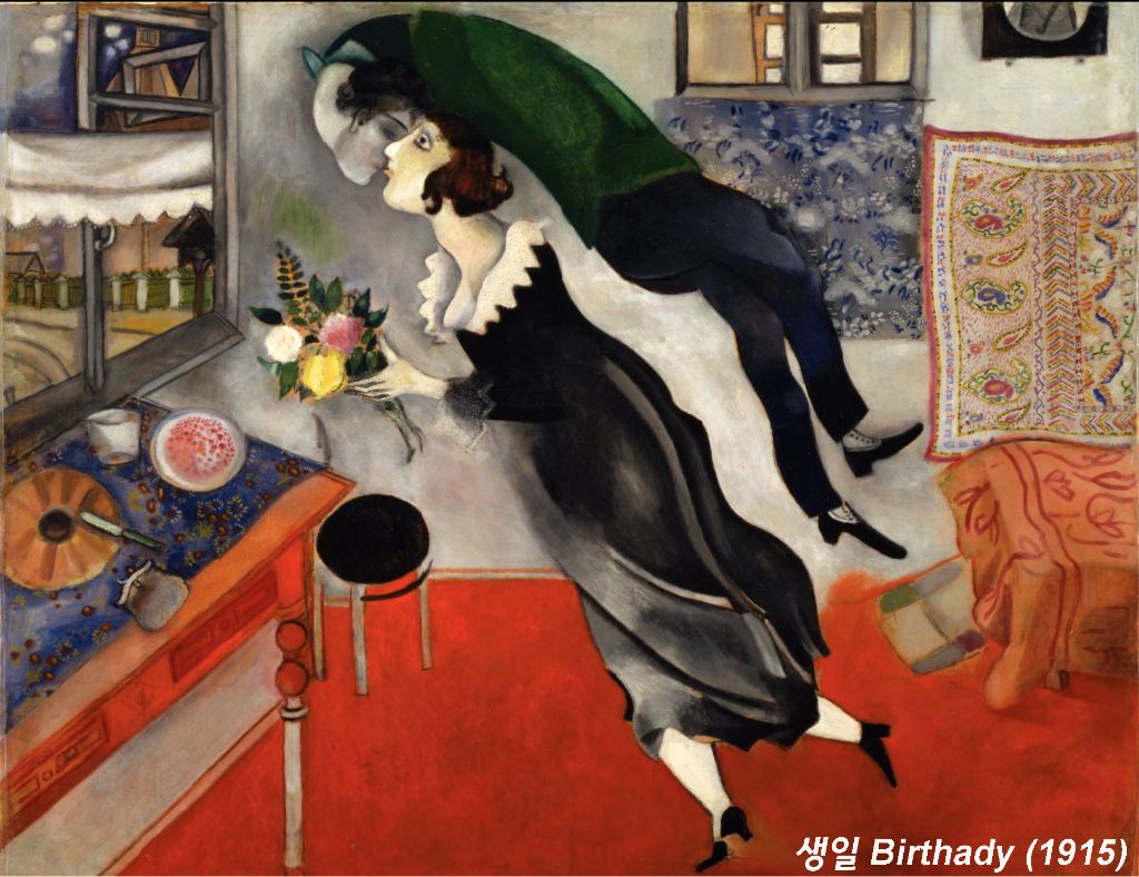 결혼식을 열흘 앞둔 생일날, 샤갈은 벨라의 뒤에서 날아와 입 맞추는 걸작을 완성하였습니다.