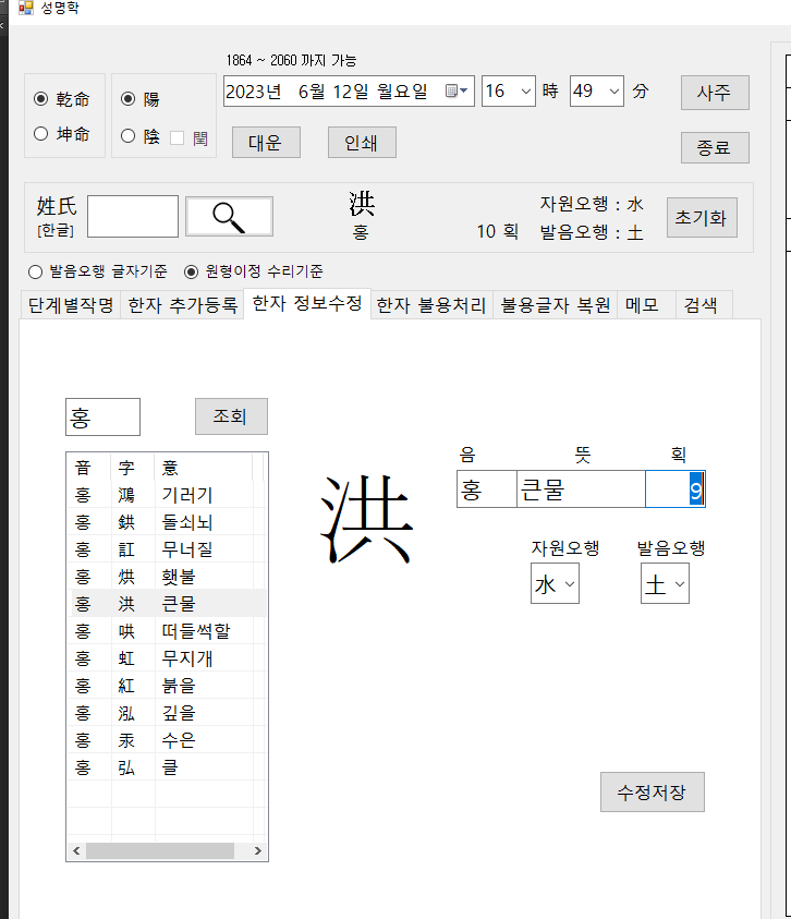 일부 洪 자를 9획으로 보는 견해도 있는데 이럴 경우에 직접 획수를 9획으로 수정하고 수정저장 버튼을 클릭하시면 됩니다.