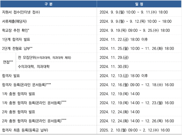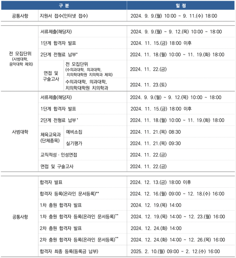 상기 일정은 학내/외 사정에 따라 변경될 수 있습니다. 또한 1단계 합격자는 2단계 전형료를 반드시 기간 내에 납부해야 하며, 미납 시 2단계 전형에 응시할수 없습니다. 사범대학의 경우 교직적성/인성면접은 면접에 포함하여 실시합니다. 마지막으로 합격자는 반드시 기간 내에 온라인 문서등록(예치금 납부 없이온라인으로 등록의사를 확인하는 절차)을 완료해야 하며, 미등록시 등록을 포기하는 것으로 간주합니다.