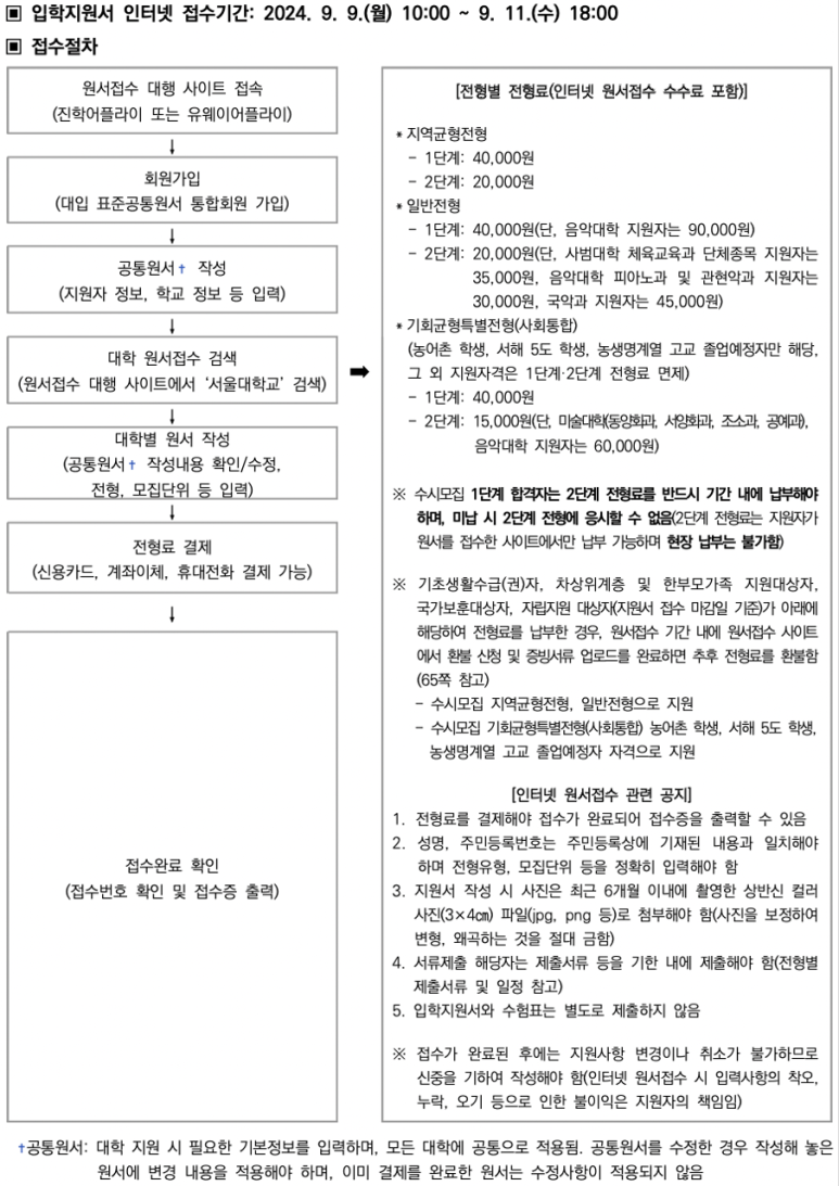 인터넷 원서 접수 기간은 2024년 9월 9일 월요일 오전 10시부터 9월 11일 수요일 오후 6시까지입니다. 기간을 지키지 못하면 그 어떠한 방법으로도 서울대학교에 수시 지원할 수 없으니 꼭 숙지해주세요!