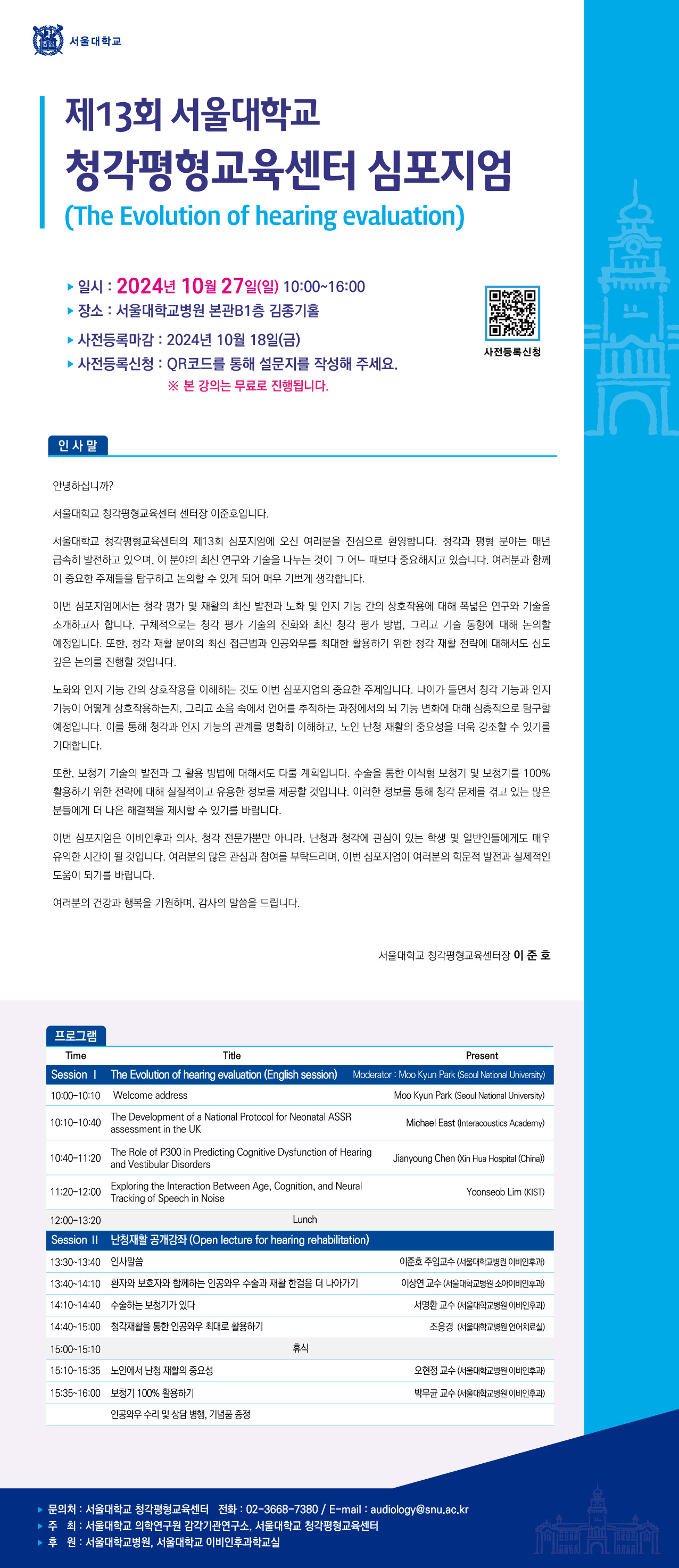 10월 27일에 진행 예정인 제 13회 서울대학교 청각평형교육센터 심포지엄을 안내드립니다.