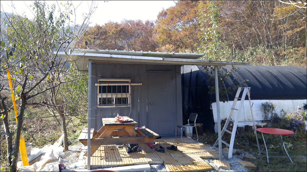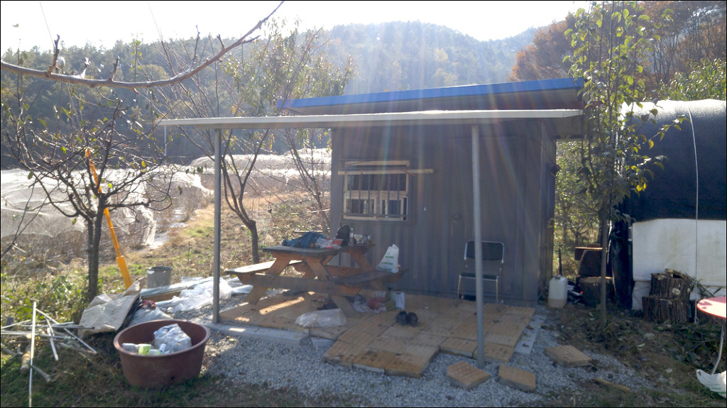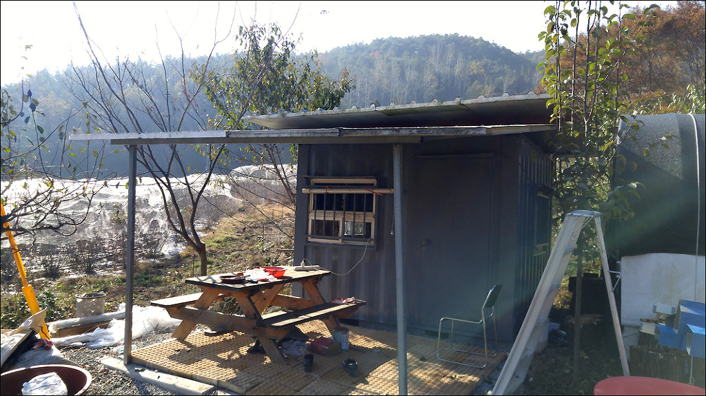 컨테이너 농막 3*3 농막과 그 앞에 그 만큼 지붕을 만들어 휴식공간으로 만들려고 작업을