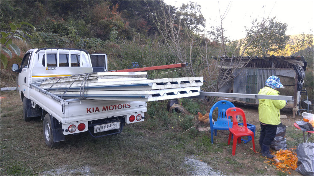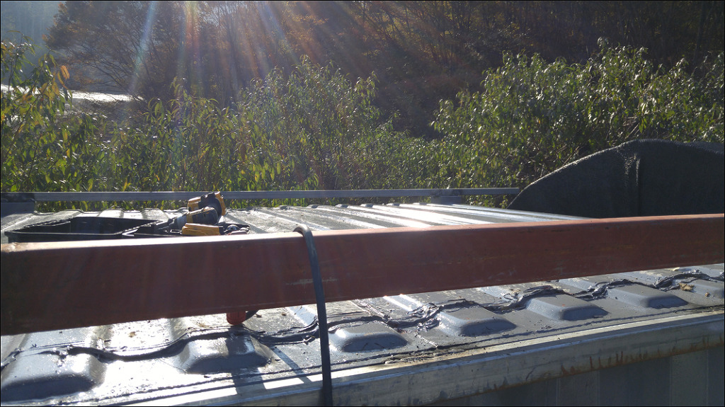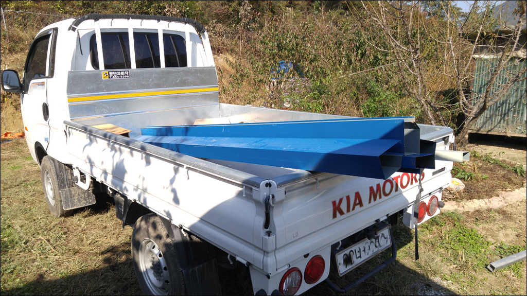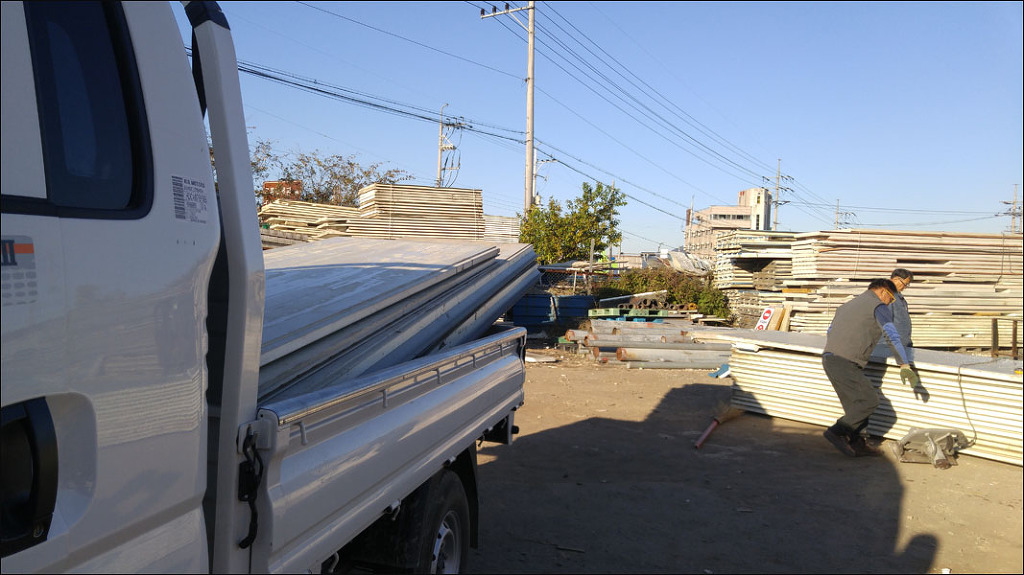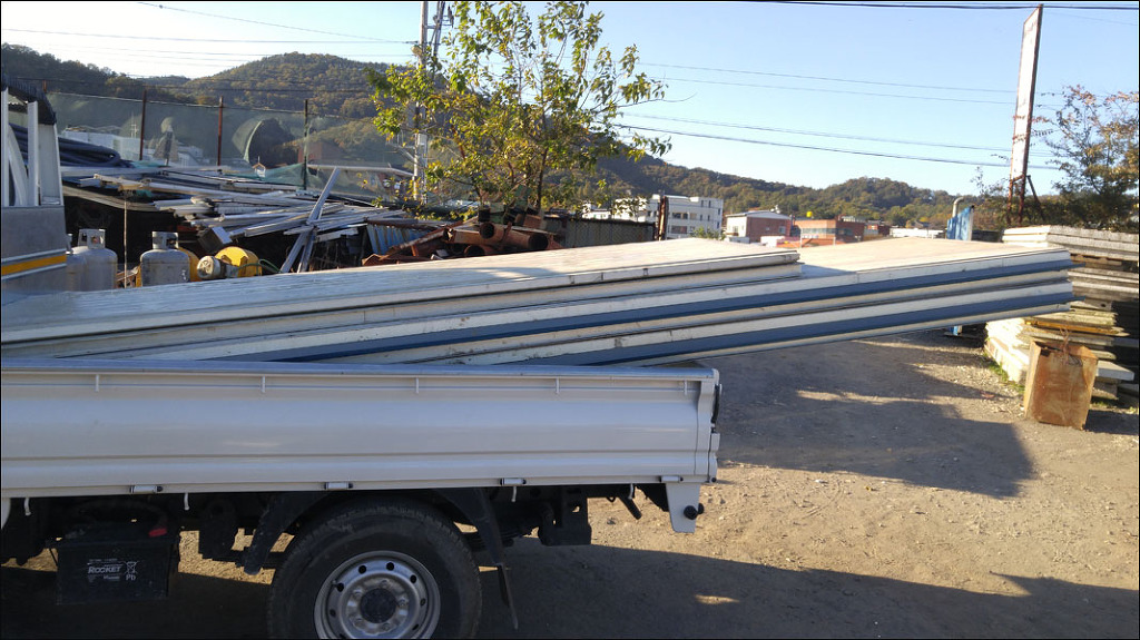 지붕 재료로 중고판넬과 중고각파이프를 구입하였습니다.