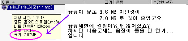 제가 한 것은 2.07 MB 로 많이 줄었는데도 들을 만 하네요. 이젠 문제없이 하모친구 카페에 올릴