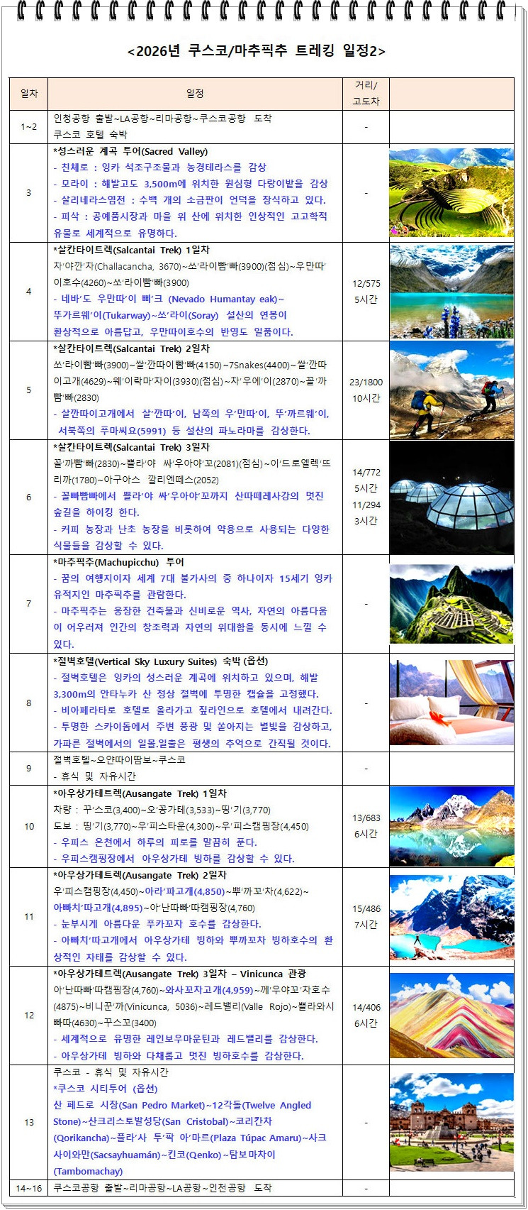 2. 2026년 쿠스코/마추픽추 트레킹 전체 일정표(2026년 5월 19일~6월 3일(16일))