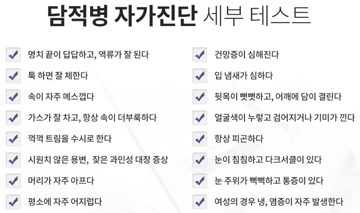 때문에 신경성위염 증상이 지속적으로 반복된다면 담적병을 의심해보는 것이 좋은데요. 담적병 자가진단을 통해 스스로 담적병을 예측해 볼 수 있습니다.