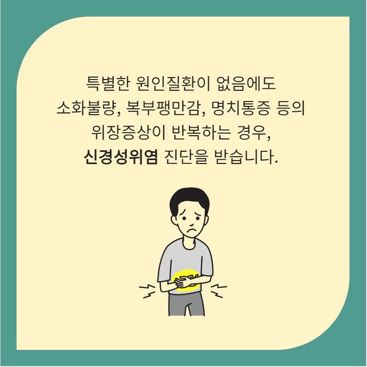 신경성위염은 특별한 원인 질환이 없음에도 소화불량, 복부팽만감, 명치통증 등의 증상이 반복해서 나타나는 것을 의미합니다. 우리나라 인구의 10%에게 발병될 만큼 흔한 질환이지만 정확한 원인이 발견되지 않았고 각종 검사에서도 특별한 이상을 발견할 수 없어 치료가 까다롭습니다.