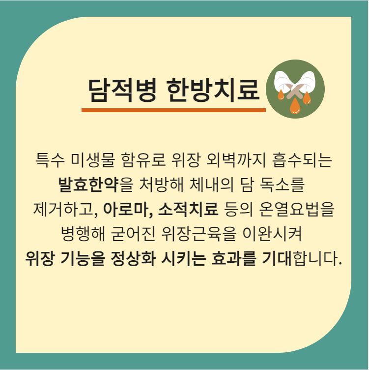 진단된 담적은 근본원인인 담 독소를 제거하고 굳어진 위장을 풀어내는 치료를 통해 위장의 기능이 정상화 되도록 기대할 수 있는데요. 특수 미생물이 함유된 발효한약은 위장 외벽까지 침투해 담 독소를 분해하고 배출하여 담 독소를 제거해 위장의 문제를 개선하고, 아로마, 소적치료 등의 온열요법을 병행해 담적으로 인해 굳어진 위장의 근육층을 이완시켜 담적을 녹이고 위장을 부드럽게 이완시켜 운동성을 높여 기능을 정상화 시키도록 합니다.