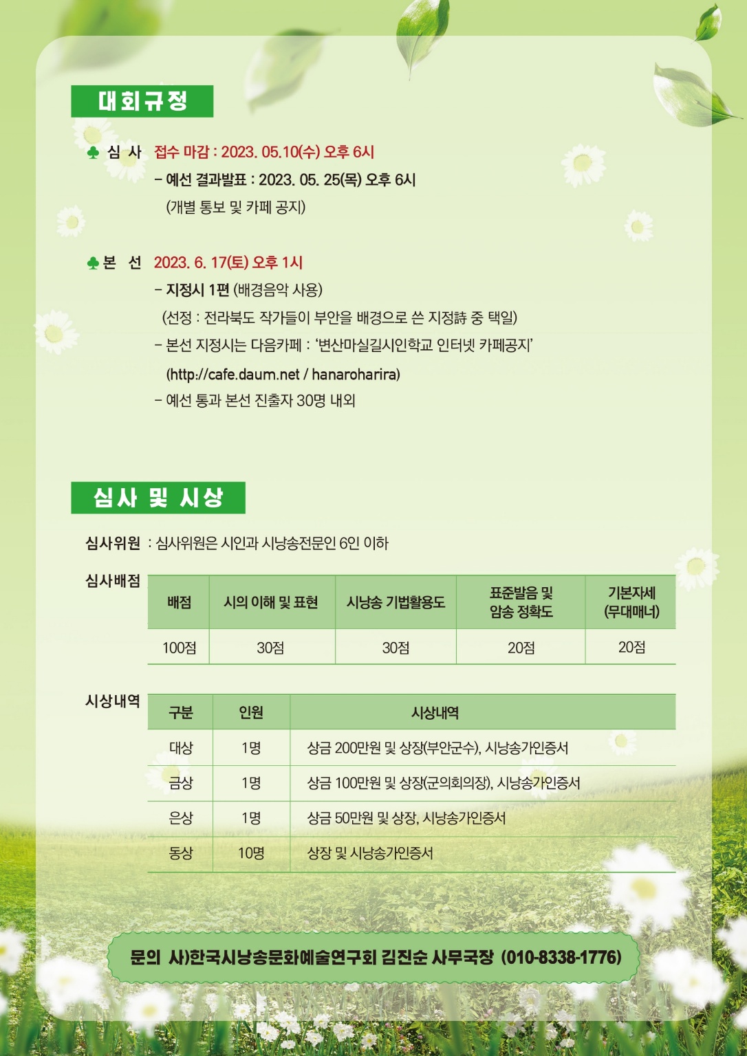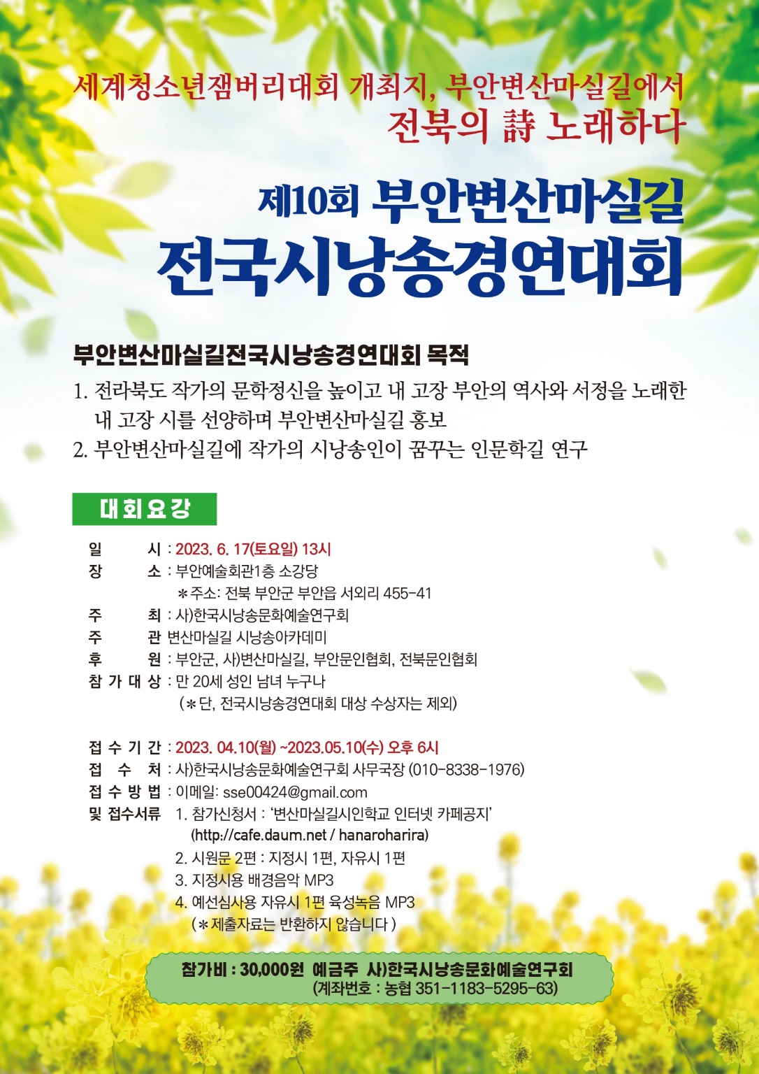 2023년 제10회 부안변산마실길 전국시낭송경연대회 공고 작성자해바라기|작성시간23.04.14|조회수994 목록 댓글 0 글자크기 작게가 글자크기 크게가 제10회부안변산마실길전국시낭송경연대회 참가신청서1.hwp15.50KB제10회부안변산마실길전국시낭송경연대회 본선대회 지정시(2023.6.17).zip689.52KB2023년 제10회부안변산마실길 전국시낭송경연대회를 아래와 같이 공지 하오니 우수한 시낭송가들의 많은 참여있으시길 바랍니다. 첨부파일첨부된 파일이 4개 있습니다. zip 파일 제10회부안변산마실길전국시낭송경연대회 본선대회 지정시(2023.6.17).zip 다운로드 jpg 파일 KakaoTalk_20230330_130334762.jpg 다운로드 jpg 파일 KakaoTalk_20230330_130351577.jpg 다운로드 hwp 파일 제10회부안변산마실길전국시낭송경연대회 참가신청서1.hwp 다운로드 다음검색 현재 게시글 추가 기능 열기 북마크 공유하기 신고 센터로 신고 댓글 댓글 0 댓글쓰기 답글쓰기 댓글 리스트