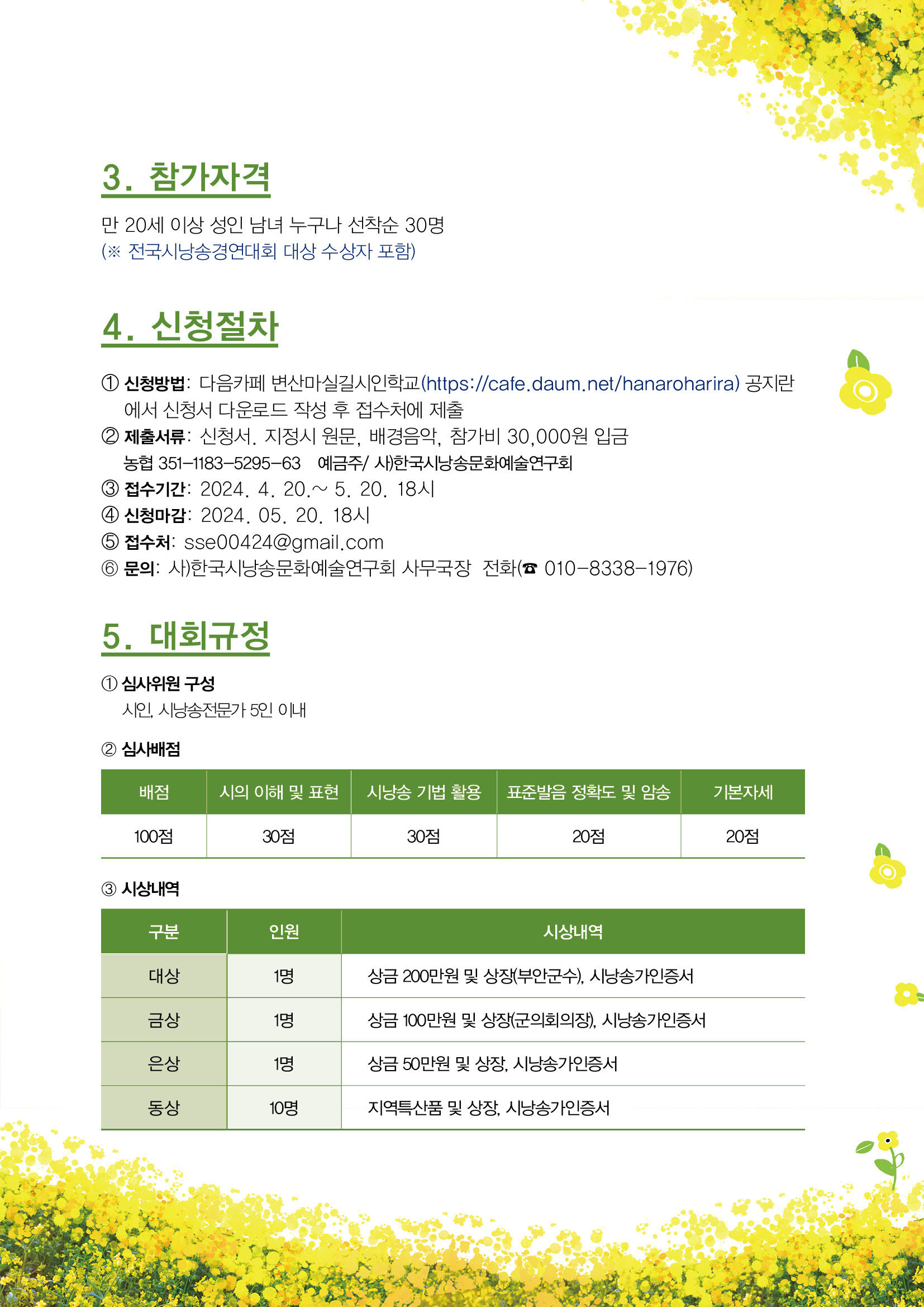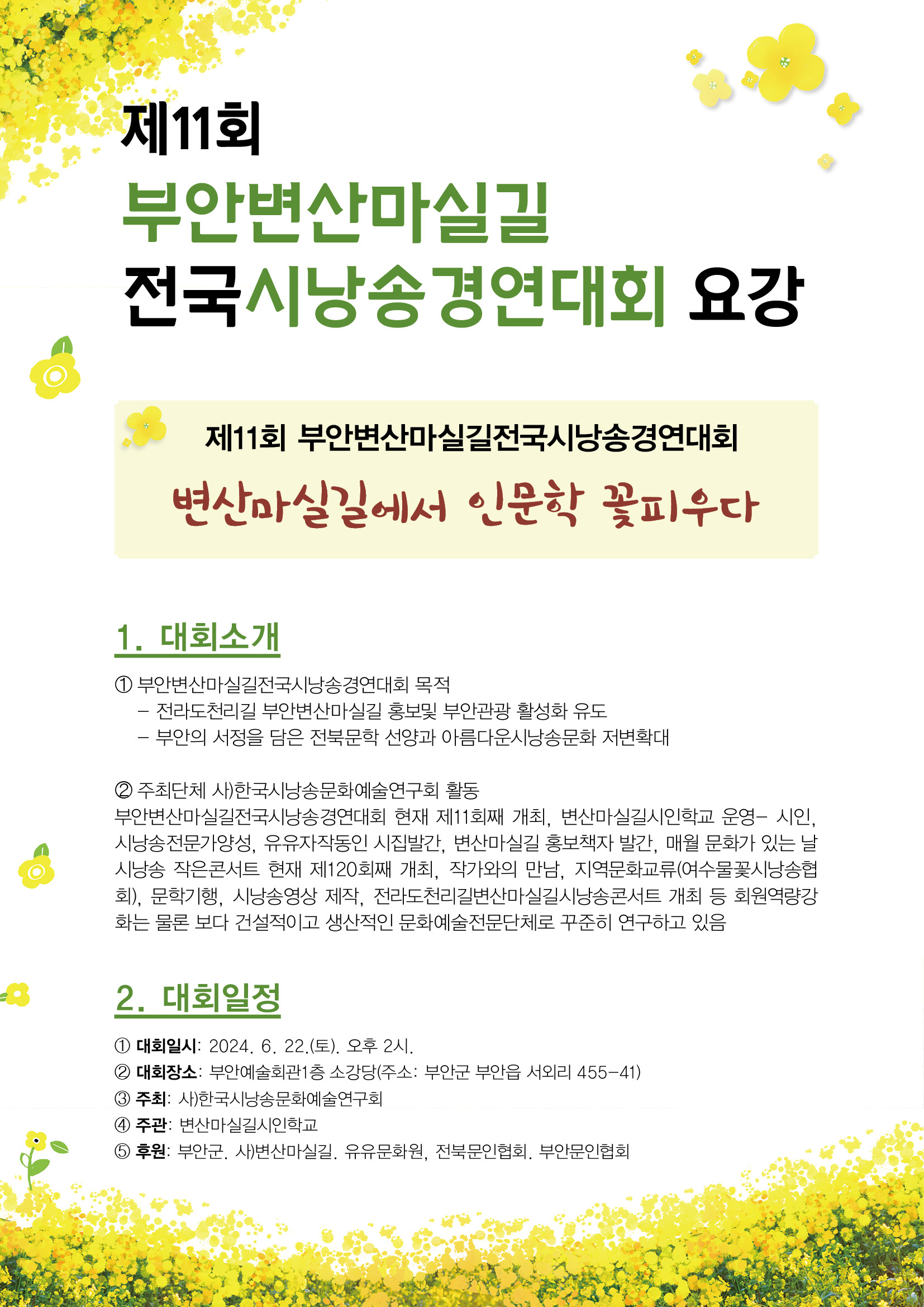 [시낭송행사]제11회 부안변산마실길 전국시낭송대회 공고 작성자손효성|작성시간24.04.16|조회수678 목록 댓글 0 글자크기 작게가 글자크기 크게가 참가신청서-2024년도 제11회부안변산마실길전국시낭송경연대회 참가신청서-2.hwp12.50KB 첨부파일첨부된 파일이 3개 있습니다. jpg 파일 1713237104904.jpg 다운로드 jpg 파일 1713237106838.jpg 다운로드 hwp 파일 참가신청서-2024년도 제11회부안변산마실길전국시낭송경연대회 참가신청서-2.hwp 다운로드 다음검색 현재 게시글 추가 기능 열기 북마크 공유하기 신고 센터로 신고 댓글 댓글 0 댓글쓰기 답글쓰기 댓글 리스트