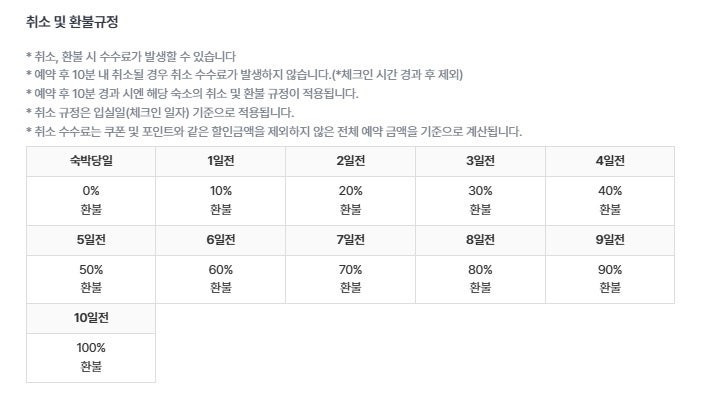 취소 수수료: 성수기·비수기, 취소 시점(체크인 전/당일 등)에 따라 수수료 부과 또는 환불 불가.