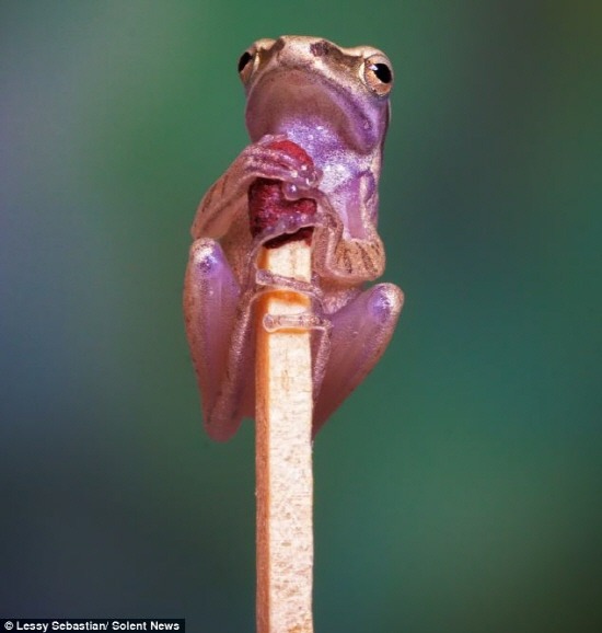 보통 크기의 성냥을 잡고 있는 개구리니까,